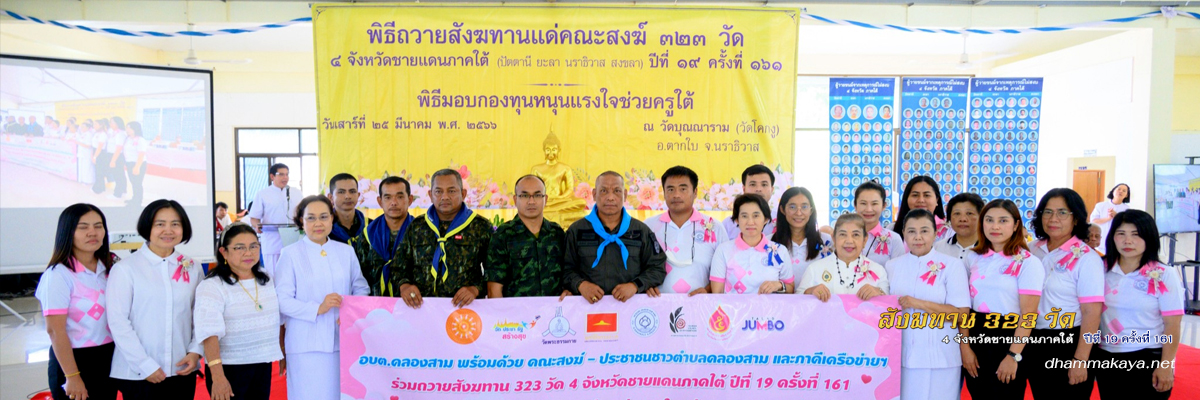 วันที่ 25 มีนาคม พ.ศ.2566 วัดพระธรรมกาย จังหวัดปทุมธานี มูลนิธิธรรมกาย และกัลยาณมิตรทั่วทั้งโลก ร่วมกับ คณะสงฆ์จังหวัดนราธิวาสหน่วยงานภาครัฐ ภาคเอกชน และประชาชนจังหวัดนราธิวาส จัดพิธีถวายสังฆทานแด่คณะสงฆ์ 323 วัด พิธีทำบุญอุทิศส่วนกุศลแด่ผู้วายชนม์จากเหตุการณ์ความไม่สงบ 4 จังหวัดชายแดนภาคใต้ (ปัตตานี ยะลา นราธิวาส และ 4 อำเภอในจังหวัดสงขลา) ปีที่ 19 ครั้งที่ 161 และพิธีมอบกองทุนหนุนแรงใจช่วยครูใต้ ปีที่ 16 ครั้งที่ 126 จำนวน 159 กองทุน ณ วัดบุณณาราม (วัดโคกงู) อำเภอตากใบ จ.นราธิวาส พร้อมถ่ายทอดออนไลน์ ผ่านแอปพลิเคชัน ZOOM, FACEBOOK LIVE และ YouTube มีพุทธศาสนิกชนทั้งในและต่างประเทศร่วมกิจกรรมเป็นจำนวนมาก