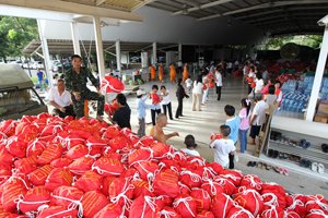 ศูนย์ช่วยเหลือวัดและผู้ประสบภัยน้ำท่วม ร่วมกับมูลนิธิธรรมกาย มอบถุงยังชีพช่วยเหลือวัดและผู้ประสบภัยน้ำท่วม